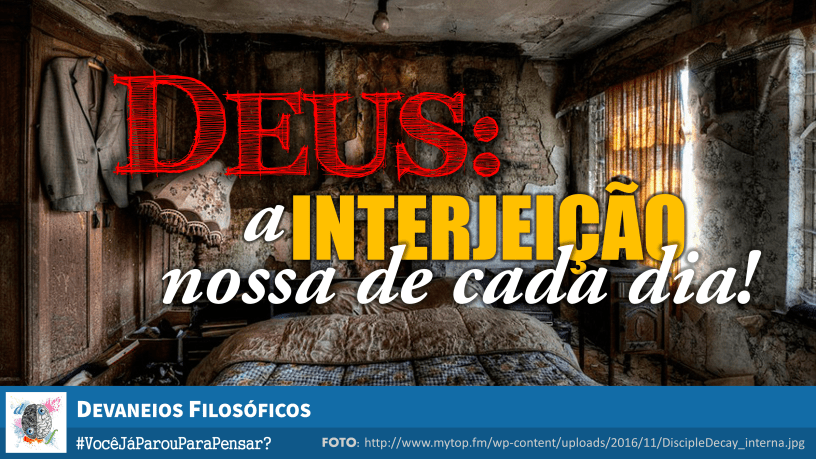 Quando digo que “Deus” é a interjeição nossa de cada dia, refiro-me principalmente ao uso dessa palavra desprovido de seu significado pleno (Deus enquanto entidade divina, adorado em alguma religião), mas que é, por outro lado, imbuído de sentido. Quando queremos pedir ou clamar por algo e dizemos “pelo amor de Deus”, na verdade estamos expressando isso simplesmente no sentido de “por favor”; Quando nos aproximamos de um idoso católico, existe o costume de dizer-lhe “Bênção, Sr. Z“, que nos responde “Deus te abençoe”. Esse “Deus te abençoe” é dito em que sentido? Seria no sentido mais comum de bênção (voto de felicidade), ou mais próximo de seu sentido no hebraico (algo celestial dado por Deus a nós. Dt. 16:17)? A verdade é que, dado o nosso poder de transtornar transformar os sentidos das palavras, acabamos por esvaziar o significado de muitos dizeres, enquanto o seu sentido, como vimos logo de início, depende exclusivamente do contexto.