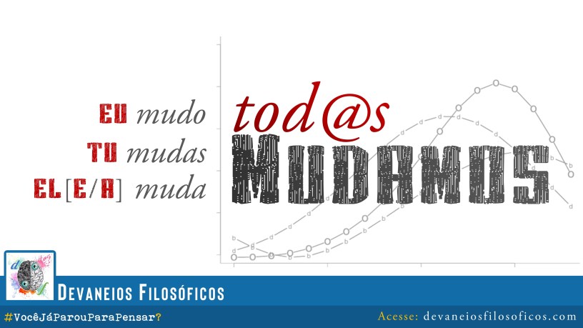 Finalizando, quero relembrar-te das palavras de Heráclito, de Éfeso, ditas há séculos: “Não se pode percorrer duas vezes o mesmo rio e não se pode tocar duas vezes uma substância mortal no mesmo estado; por causa da impetuosidade e da velocidade da mutação, esta se dispersa e se recolhe, vem e vai.” Dizendo de outra forma, “Nenhum homem pode banhar-se duas vezes no mesmo rio, pois na segunda vez o rio já não é o mesmo, nem tão pouco o homem“. Eu mudo, Tu mudas, Ele/a muda – tudo muda; tod@s mudamos! Não tenha medo de mudar, tema não saber o que está mudando em você sem que você ao menos o perceba.
